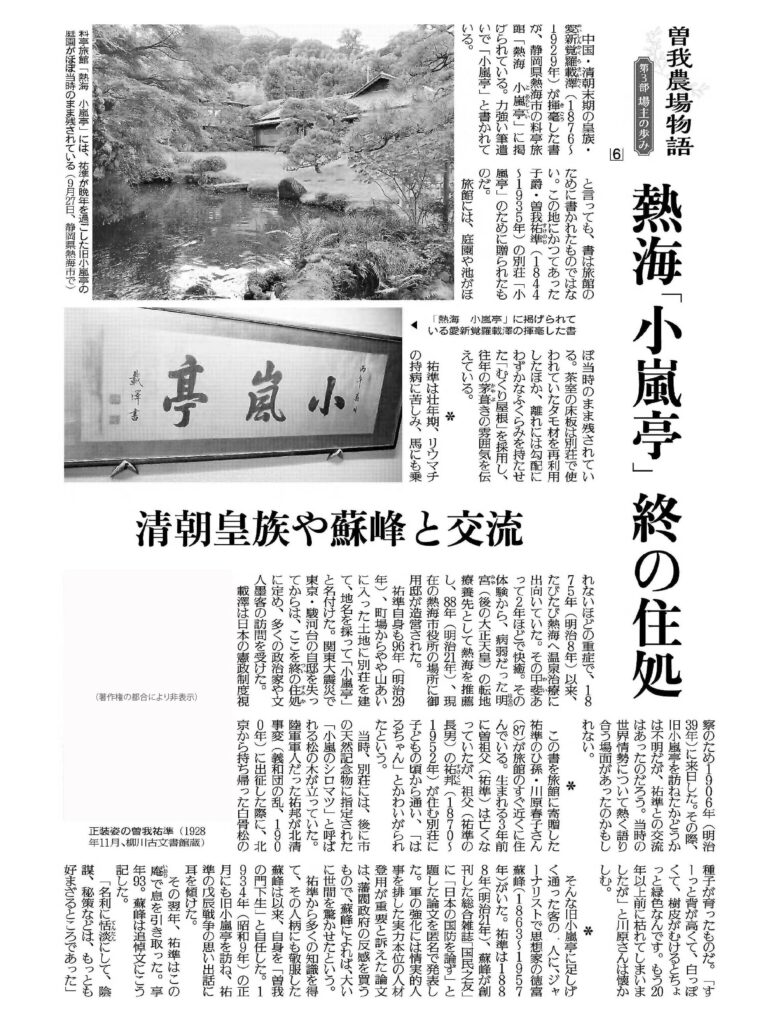 新聞掲載されました 当館の名前は、曽我祐準(そがすけのり)子爵が明治29年に建立した別荘「小嵐亭」に由来します。曽我祐準子爵が北海道ニセコに所有していた農場の歴史を紐解く連載の中で、ゆかりの地のひとつとして掲載されました。当時は皇室の方々や文人墨客が来訪した当時の様子をうかがわせるものです。 タイトル 「曽我農場物語 熱海『小嵐亭』、終の住処」 読売新聞 2025年12月14日掲載 読売新聞オンライン 2025年12月16日掲載 (新聞記事等利用の許諾済)