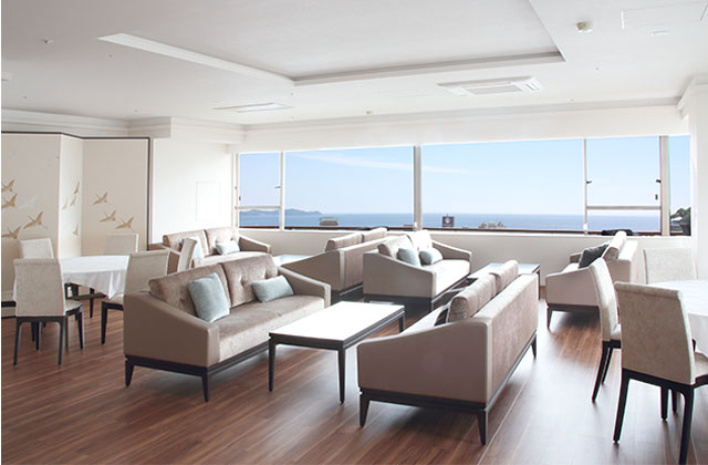 熱海湾が一望できる本館最上階の会場。